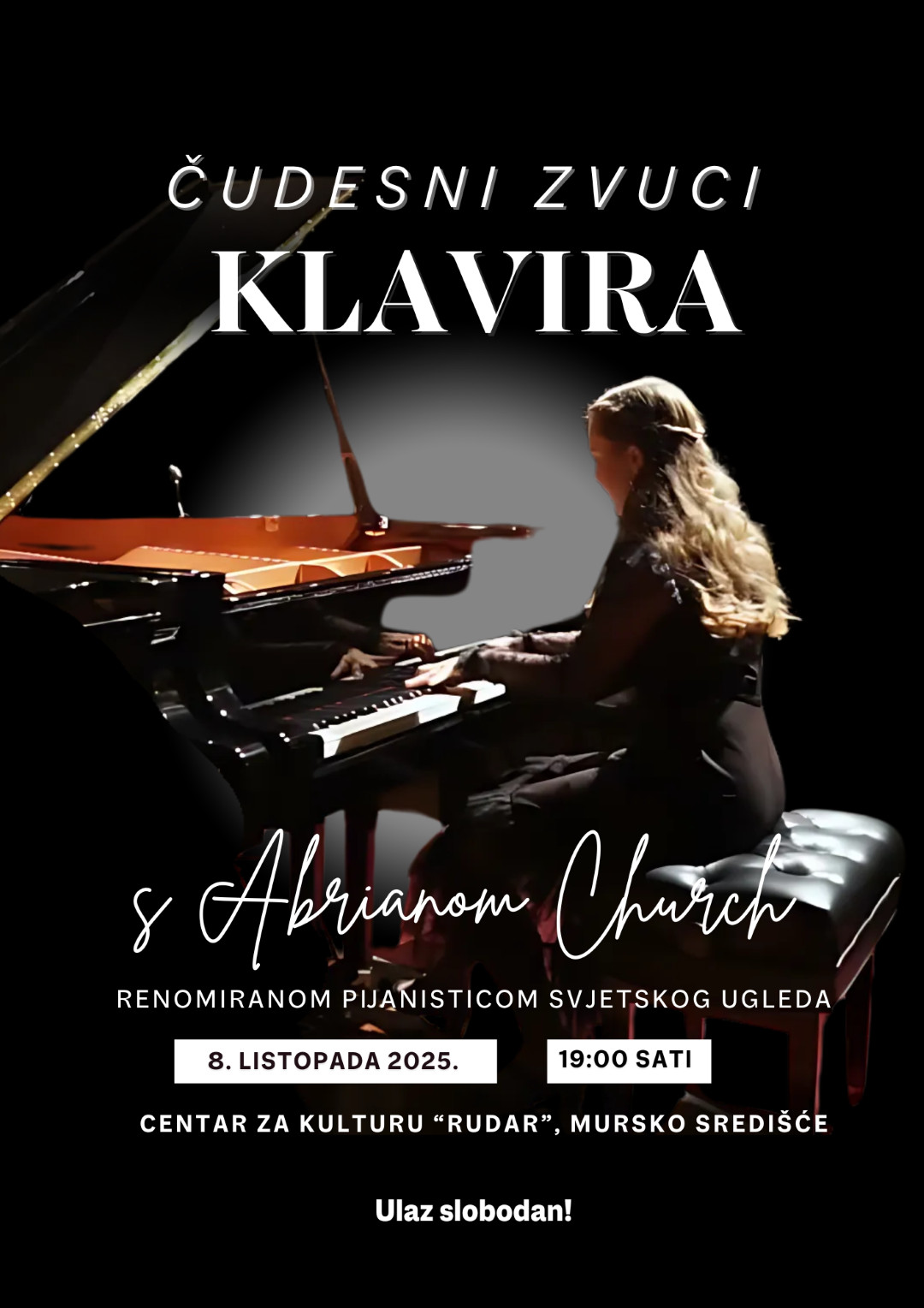 Čudesni zvuci klavira naslov je koncerta Abriane Church, poznate pijanistice, koji će se održati u Centru za kulturu „Rudar“ u srijedu, 8. listopada, s početkom u 19.00 sati. Publika će moći uživati u jedinstvenoj interpretaciji djela Chopina, Brahmsa, Bacha i drugih.